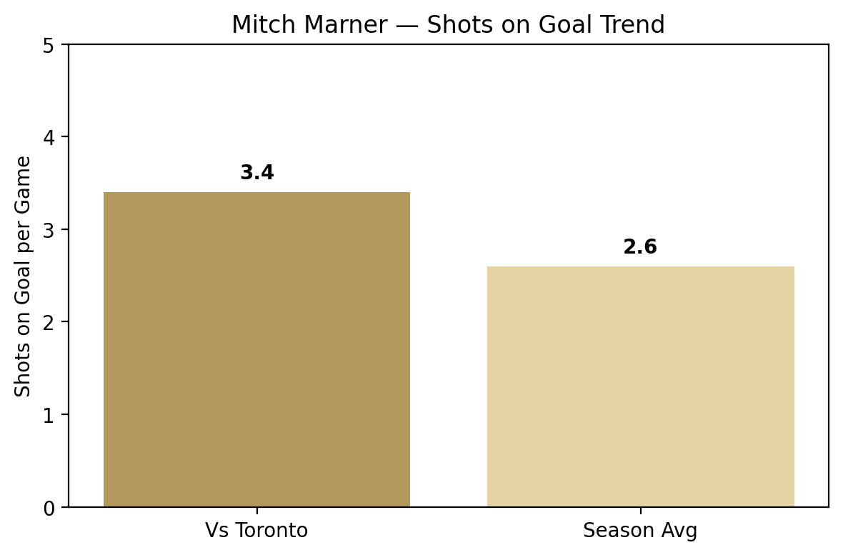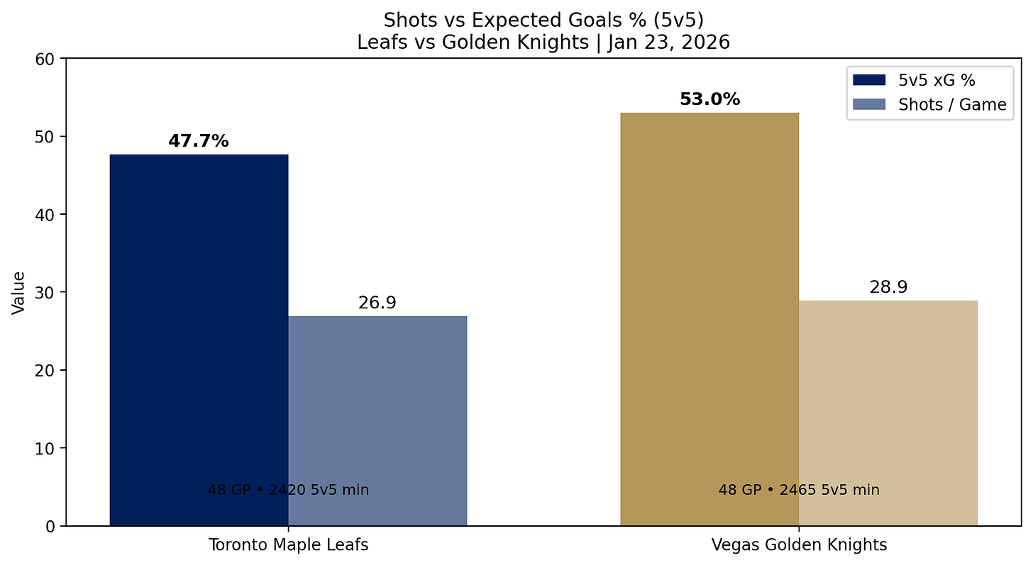 Not to get too statistical on you, readers, this chart basically shows you all you need to know in terms of offensive production when playing 5v5. Vegas is just living in the offensive zone more. More shots, better looks, and it shows up in the xG numbers. Toronto’s hanging around, but they need to turn possession into cleaner chances if they want this game on their terms tonight.